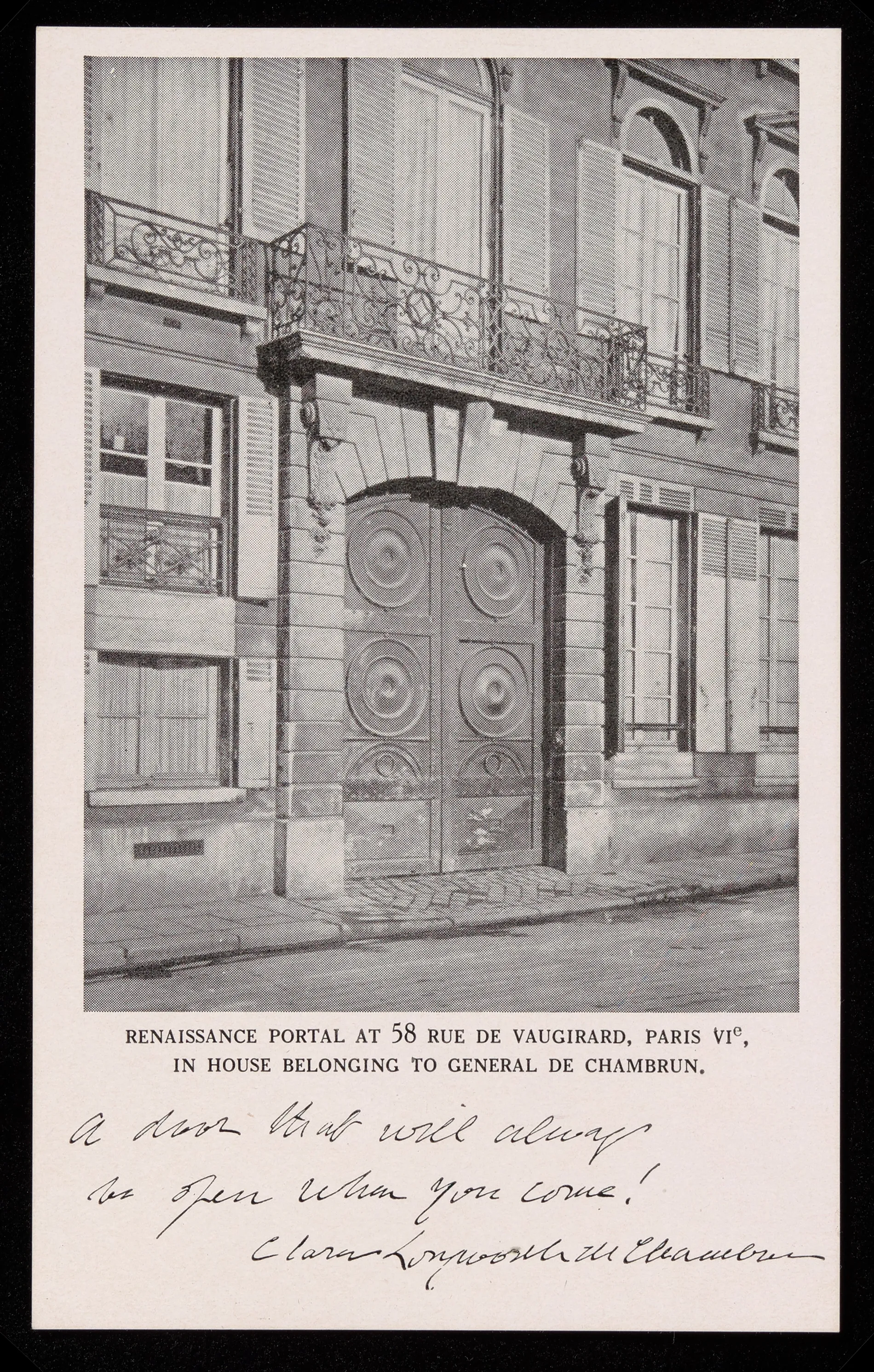Elizabeth Bishop took two post-graduation trips to France in the mid-1930s. On her first trip to Paris in 1935, she travelled with Vassar classmate Harriet “Hallie” Tompkins on a Nazi ship, objecting to the “German tourists” on board (see here). The two friends visited Paris and Versailles before relocating to the Brittany fishing village of Douarnenez. In autumn Bishop returned to Paris where she met up with another Vassar friend, Louise Crane. Bishop and Crane lived in an apartment at 58 Rue de Vaugirard, a home owned by Crane family friends the General and Comtesse de Chambrun. A postcard of the home’s “Renaissance portal” includes Mme de Chambrun’s handwritten caption, “A door that will always be open when you come!” Bishop and Crane made a second trip to Europe in 1937, arriving in France after spending two months travelling in Ireland and England. Mutual friend Margaret Miller joined Bishop and Crane to tour Burgundy by car, but a car accident in July resulted in the amputation of Miller's right arm, a traumatic event that curtailed their trip. Bishop returned to New York via Genoa just before Christmas.
